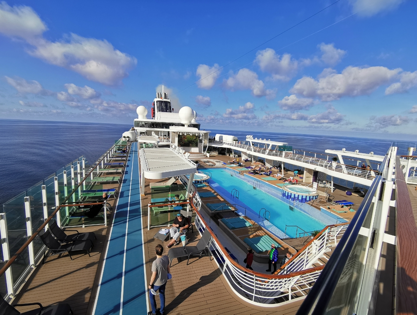 Zum leicht verspäteten Sailaway um 19:38 Uhr verlegten wir zur Überschau Bar.