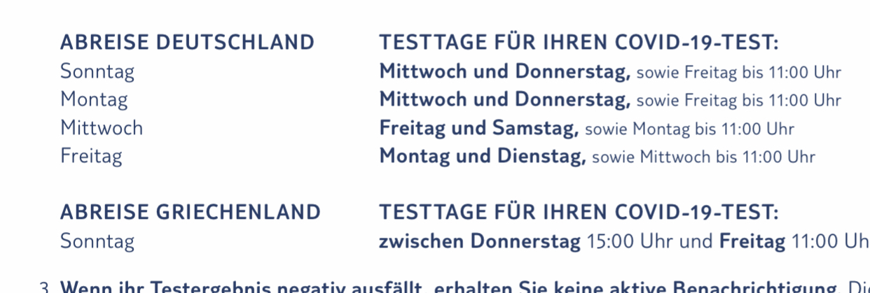 Bei Einschiffung in Griechenland musst Du eben zwischen Do.,15 Uhr und Fr., 11 Uhr vor Abreise am Sonntag in Deutschland in eine Helios-Klinik!