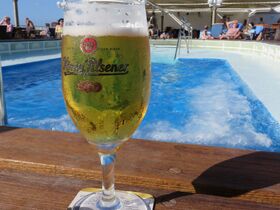 Eine Außenbar gibt es nicht. Du kannst aber auf dem Pooldeck Getränke bestellen Die holt sich dann die Bediencrew aus dem Palmengarten. Der Palmengarten ist das Büfettrestaurant auf dem Sonnendeck (Pooldeck). Es befindet sich vorne (am Bug). Ist das Wetter schön, wird mittags ein Büfett auf dem Pooldeck im Freien aufgebaut.