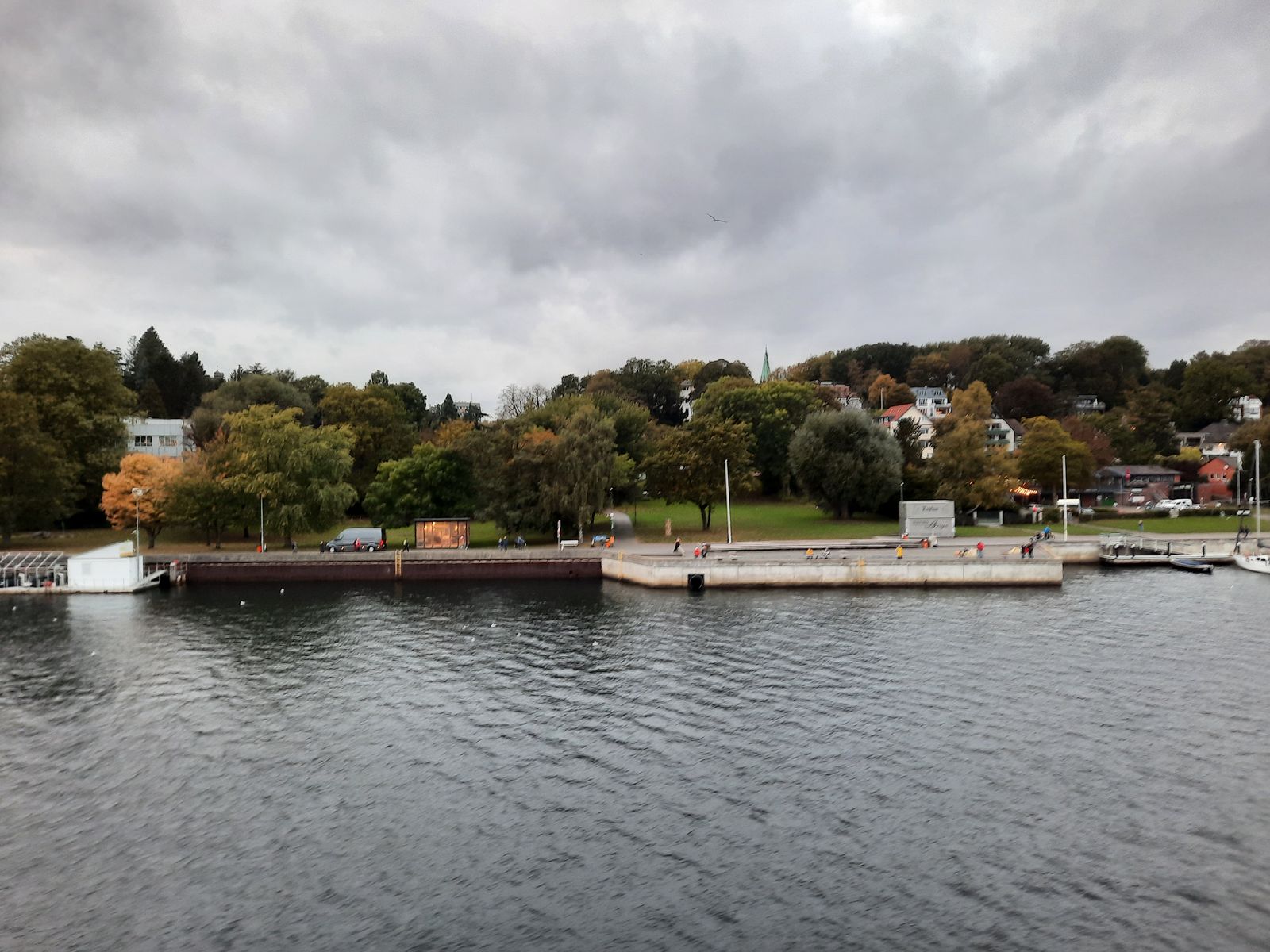 auf dem rechten Bootssteg neben dem Ruderboot knipst einer mit weißer Jacke das Auslaufmanöver der MS Hamburg am 14.10.2021
