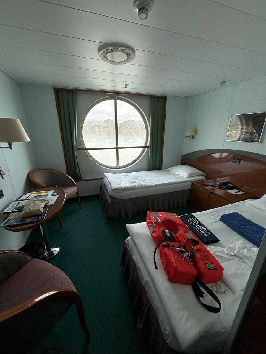 ..So, zunächst zum Schiff selbst. Ich hatte eine Einzelkabine und das Glück, diese auf Deck 2 zu bekommen. Ich konnte vom Bett aus auf die Fjorde und Eisberge schauen.