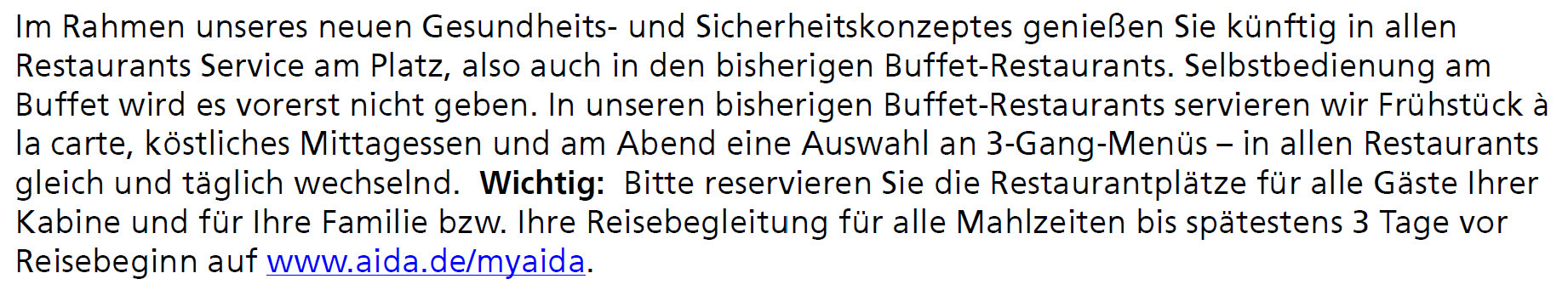 "Im Rahmen unseres neuen Gesundheits- und Sicherheitskonzeptes genießen Sie künftig in allen Restaurants Service am Platz, also auch in den bisherigen Buffet-Restaurants. Selbstbedienung am Buffet wird es vorerst nicht geben. In unseren bisherigen Buffet-Restaurants servieren wir Frühstück à la carte, köstliches Mittagessen und am Abend eine Auswahl an 3-Gang-Menüs – in allen Restaurants gleich und täglich wechselnd."