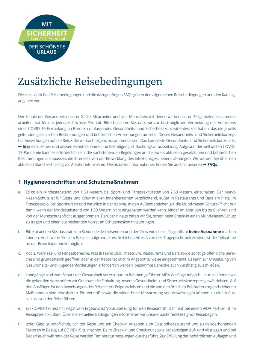 inzwischen habe ich die aktuellen medizinischen Hinweise von AIDA zu den Bella Italia Reisen erhalten. Da geht ziemlich klar hervor, wer nicht mitfahren darf, wer vorher seinen Doc fragen soll, bei wem AIDA noch mal nachuntersuchen will ... und welche Länder AIDA als "Risikoländer" (z.B. auch Österreich, Griechenland) oder als "Hochrisikoländer" ansieht.