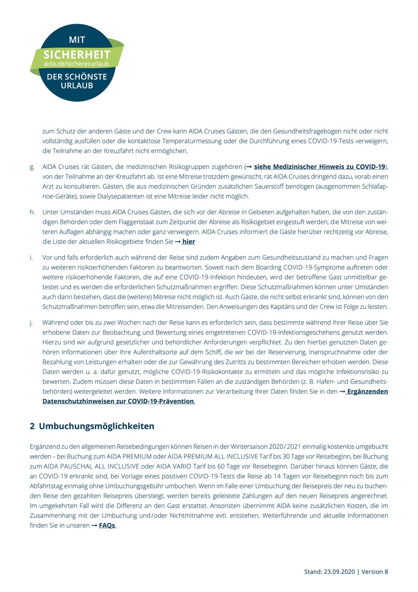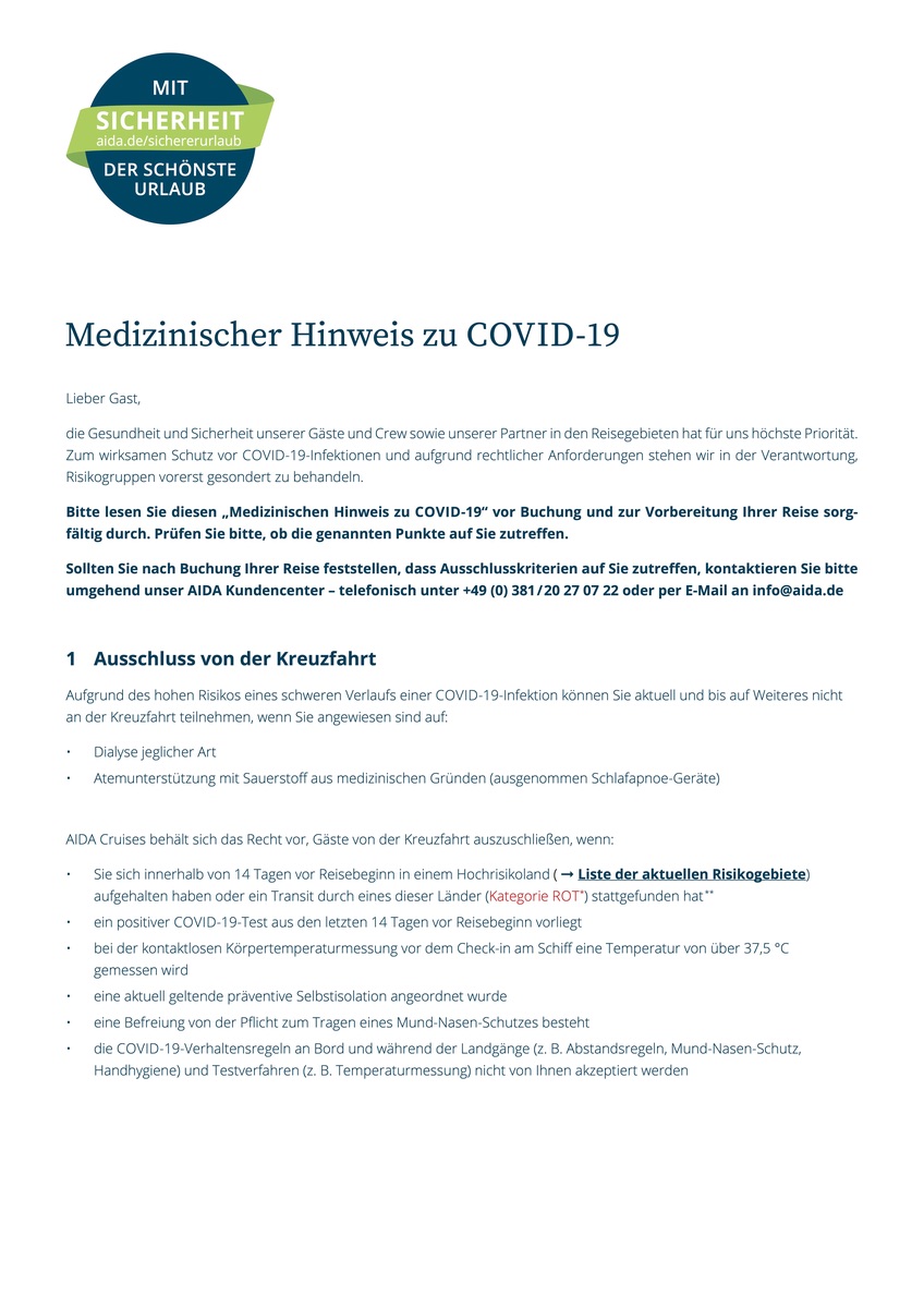 inzwischen habe ich die aktuellen medizinischen Hinweise von AIDA zu den Bella Italia Reisen erhalten.