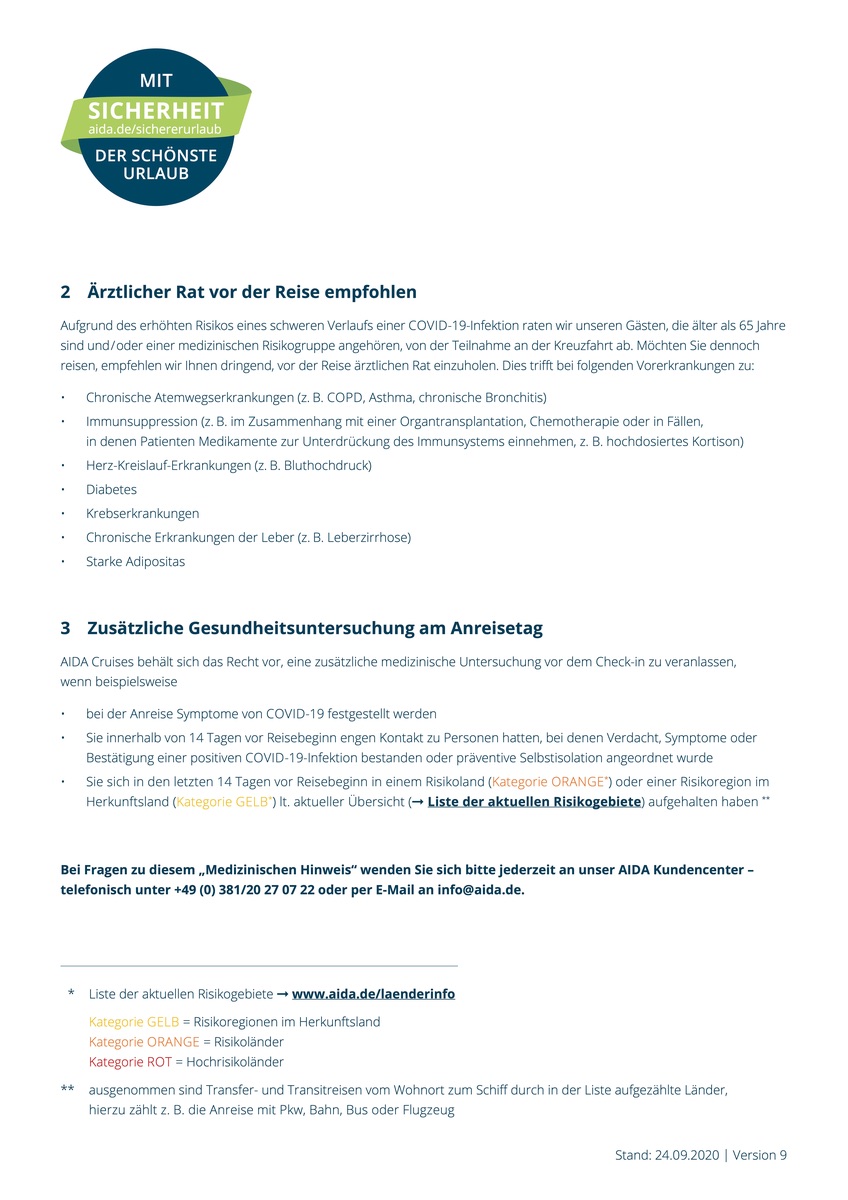 inzwischen habe ich die aktuellen medizinischen Hinweise von AIDA zu den Bella Italia Reisen erhalten. Da geht ziemlich klar hervor, wer nicht mitfahren darf, wer vorher seinen Doc fragen soll, bei wem AIDA noch mal nachuntersuchen will ... und welche Länder AIDA als "Risikoländer" (z.B. auch Österreich, Griechenland) oder als "Hochrisikoländer" ansieht.