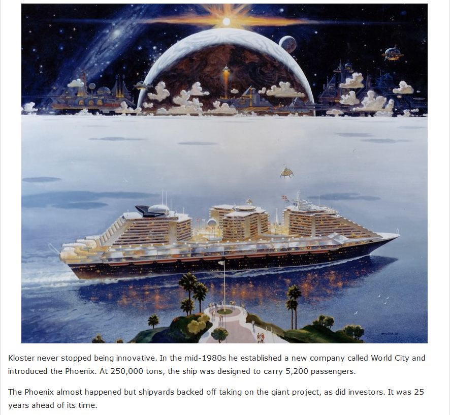 In 1983 development began ion the ultimate cruise ship! It was the World City Phoenix that was to be a mind-blowing 250,000 gross tons, just unprecedented in those days. The innovative cruise ship was to have a passenger capacity of 5,200, 1,850 crew members, and 2,600 cabins.