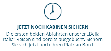 Ich habe gerade folgenden Hinweis auf der AIDA-Seite für die Bella Italia-Touren gesehen - die ersten beiden Abfahrten sind tatsächlich ausgebucht. Es gab ja eine gewisse Unsicherheit, warum diese Reisen nicht mehr sichtbar bzw. buchbar sind.