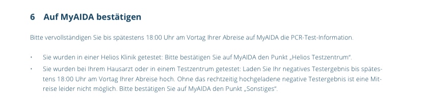 Das gilt nur für Gäste, die den Test nicht beim Vertragspartner von AIDA (Helios) gemacht haben. Von Helios wird das Testergebnis direkt an AIDA übermittelt.