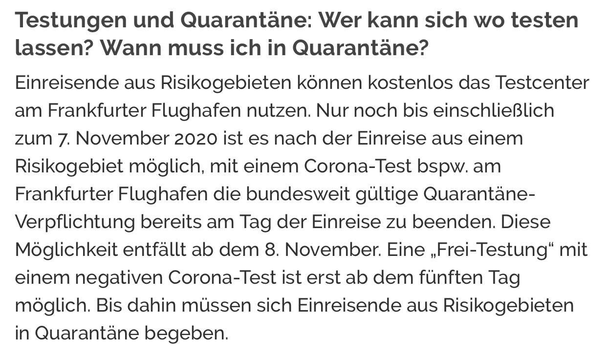 Hessische Staatskanzlei gilt ab 19.10.20 und sagt das wenn man nach Hessen einreist eine fünftägige Quarantäne besteht und danach erst der frei Tests gemacht werden kann