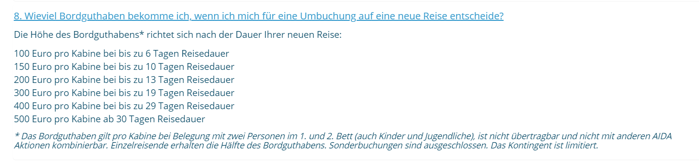 "Bitte buchen Sie die neue Reise auf http://www.aida.de/ oder in Ihrem Reisebüro und teilen Sie uns die alte und die neue Buchungsnummer an info@aida.de mit. Wir werden Ihnen daraufhin das Bordguthaben gutschreiben. Bitte haben Sie Verständnis, dass die Bearbeitung etwas Zeit in Anspruch nehmen kann."
