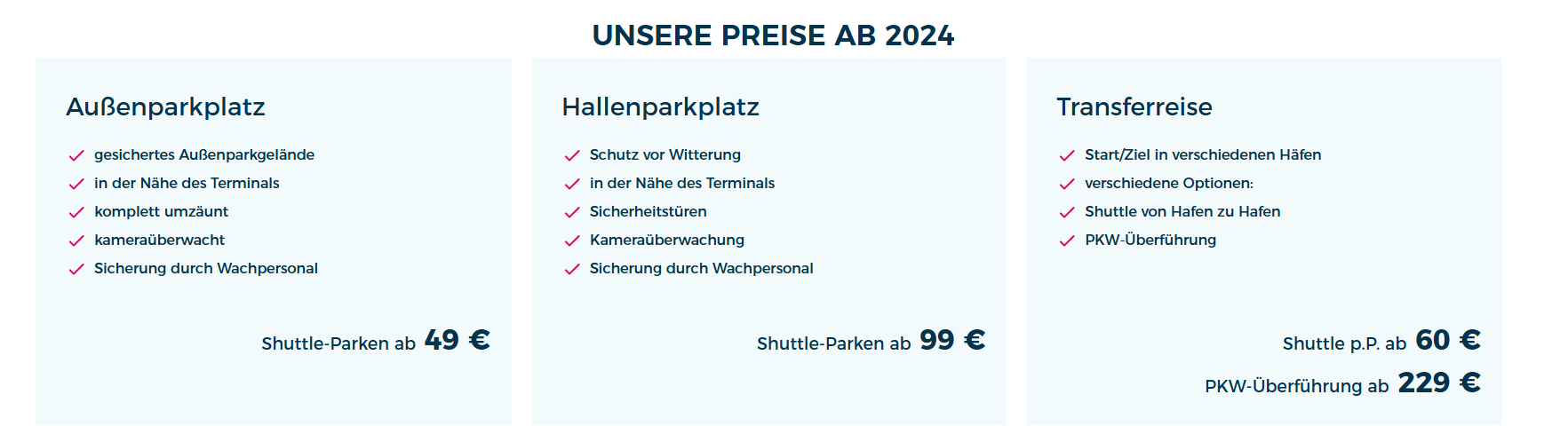 Ich war mal schauen. Die bieten das an. Unsere Reise ist aber noch nicht buchbar und dann weiß ich nicht, müssten wir Parkplatz und Transfer buchen? WENN das für uns überhaupt nötig ist. Wenn wir einen Liegeplatz haben ist das ja für uns hinfällig.