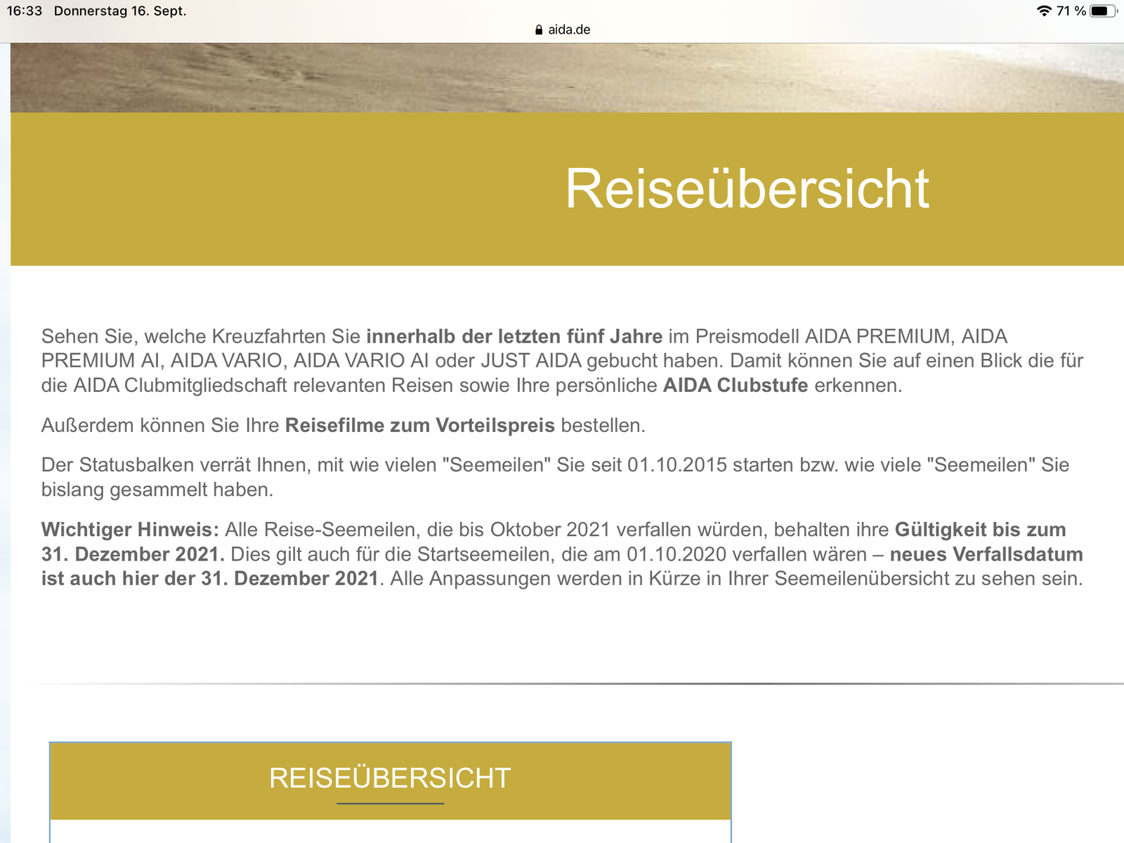 Die Reglung ist schon länger bekannt. Schau mal bei deinem Clubzugang unter Seemeilen. Neben den Reisen rechts stehen die Daten wann die Seemeilen verfallen. Die aus den Fragebögen nach 1.Jahr die der Reisen nach 5 Jahren. Aber nicht im Oktober, sonder nach Reisedatum. Aktuell ja noch Sonderregelung von Aida.