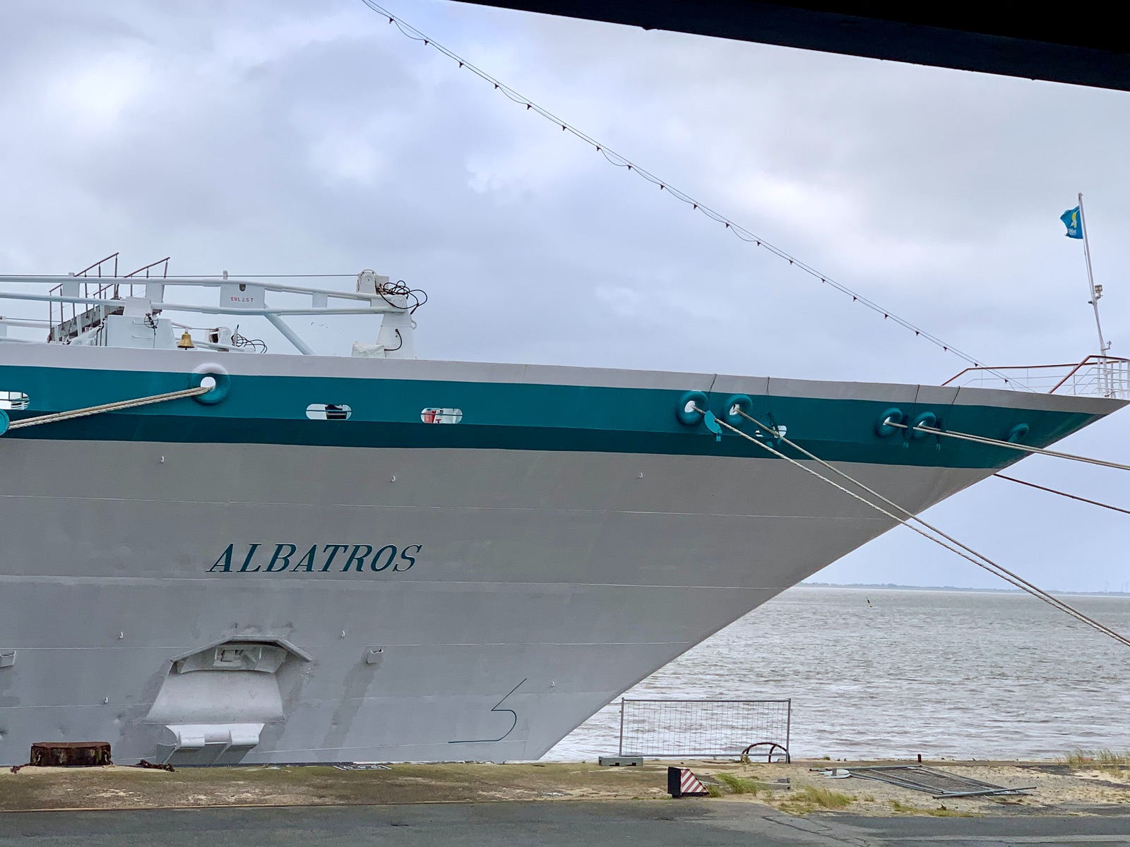Die Albatros hat gerade Bremen verlassen, wo sie seit Wochen im Neustädter Hafen lag, und fährt auf der Weser Richtung Bremerhaven. Soll dort morgen Nachmittag ankommen.