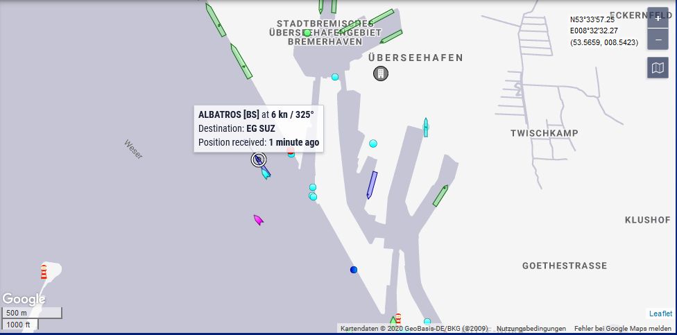 Die ALBATROS ist momentan mit 12 kn unterwegs. Dann sind die heute zum Tee in BHV .