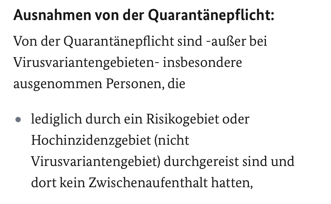 "lediglich durch ein Risikogebiet oder Hochinzidenzgebiet (nicht Virusvariantengebiet) durchgereist sind und dort kein Zwischenaufenthalt hatten,"