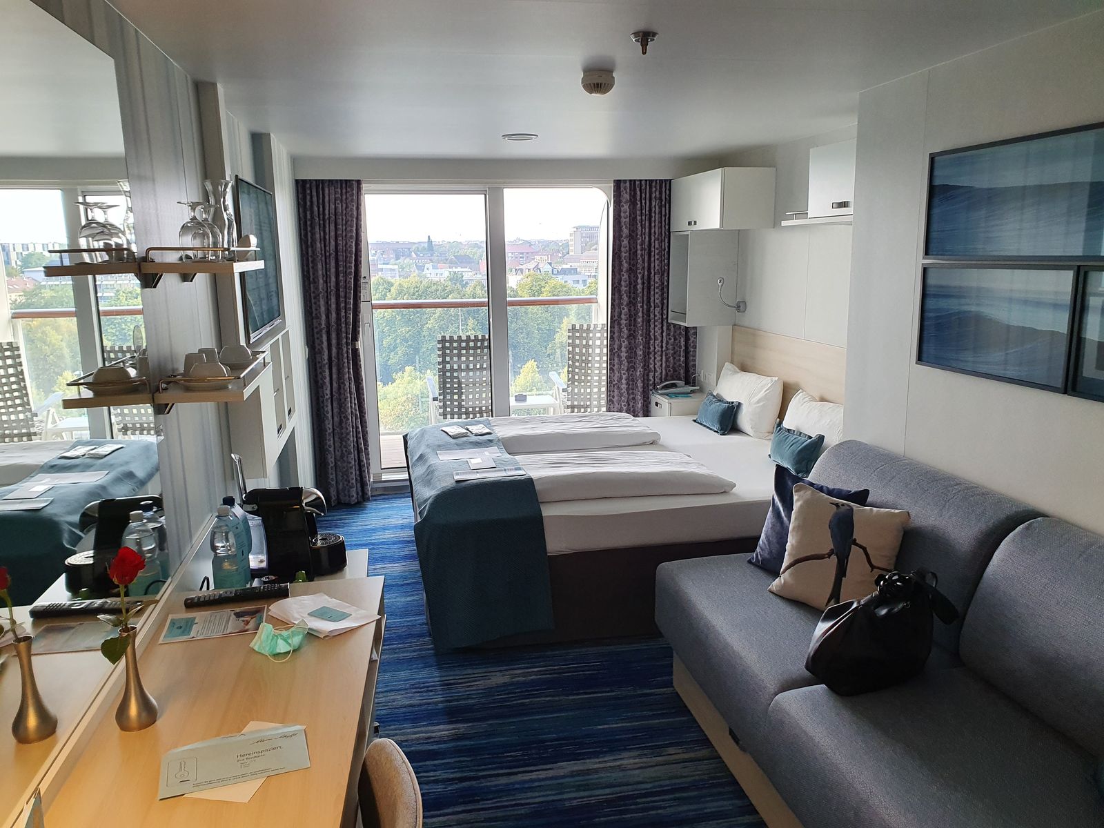 Das Bett steht entgegen der Fahrtrichtung und der Balkon lud natürlich zum Verweilen und Sonnen ein.