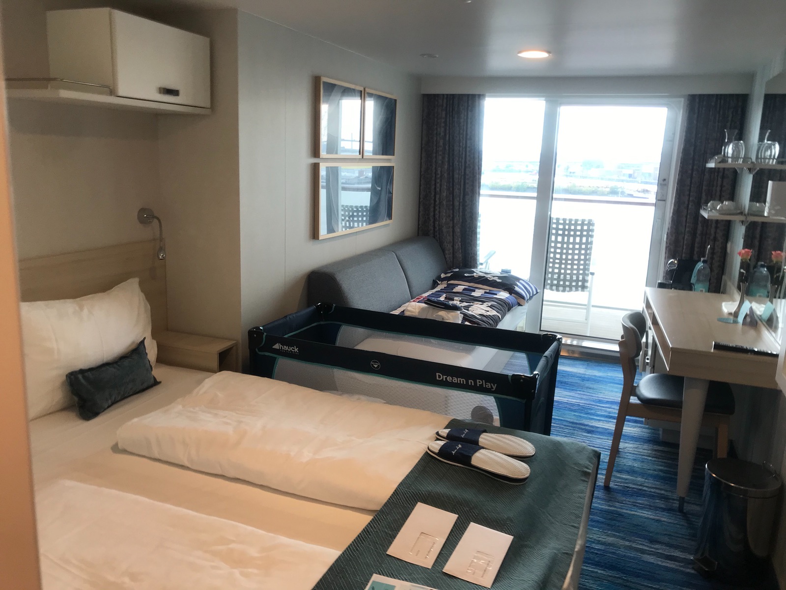 Ausgestattet ist sie mit einer Doppelbettcouch. Wir hatten die Kabine zu viert belegt, für unsere zweijährige war das Reisebett aufgestellt und für unseren Siebenjährigen war das Sofa hergerichtet. Ich habe es abends allerdings immer für ihn ausgezogen, damit er mehr Platz hat.
