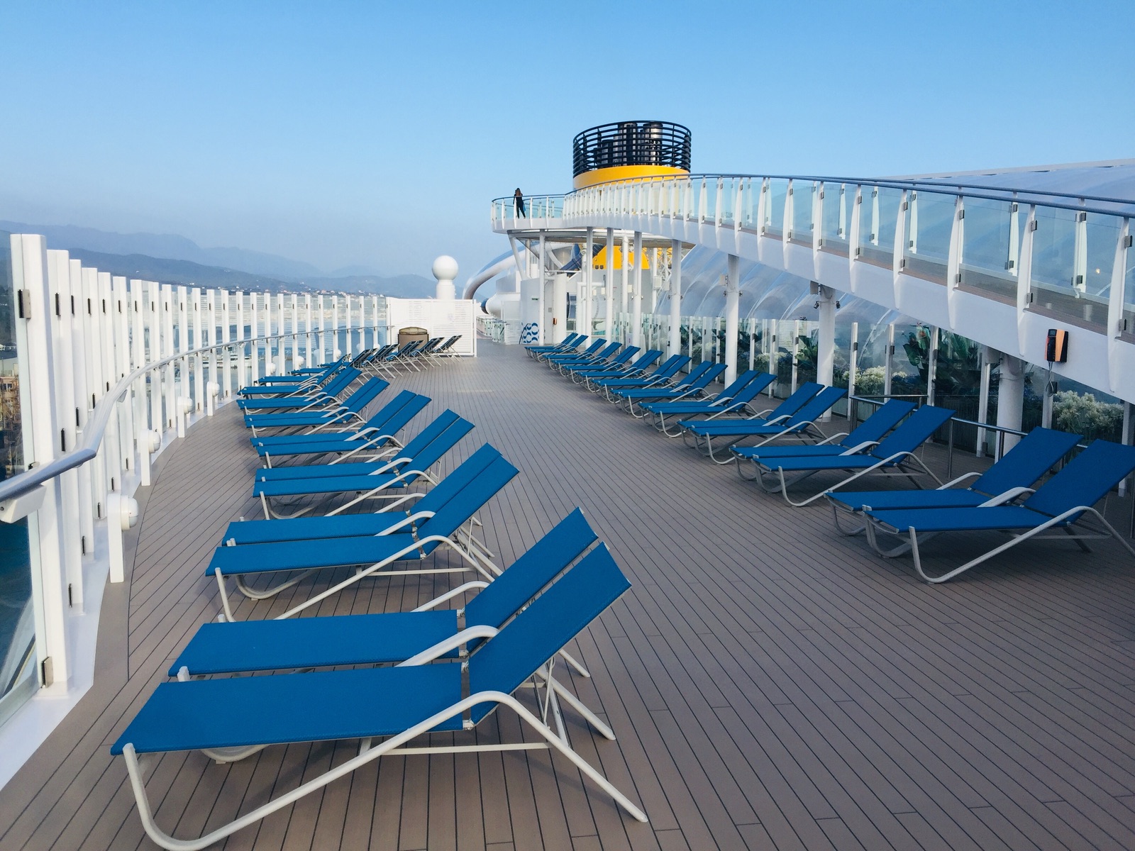 Das Schiff ist der Hammer. Da kann man auch zwei Runden hintereinander drehen, ohne Ausflüge. So schöne Liegen, Pools, Freizeitmöglichkeiten und schöne Ecken. Modern, elegant und leicht vom Design, farbenfroh.