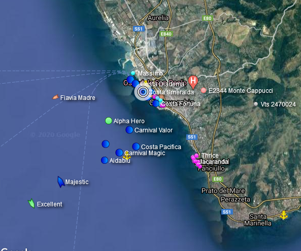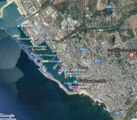 Die Bilder von Hafenratte (auch weiter oben, das Foto mit der Kaimauer) sind schön, aber auch traurig, momentan liegen in und um Civitaveccia Hafen folgende Schiffe auf Wartepositionen, hoffentlich wird es kein Schiffs-Friedhof, hoffen wir mal auf bessere Zeiten, die hoffentlich bald kommen, zuvor es zu spät ist...