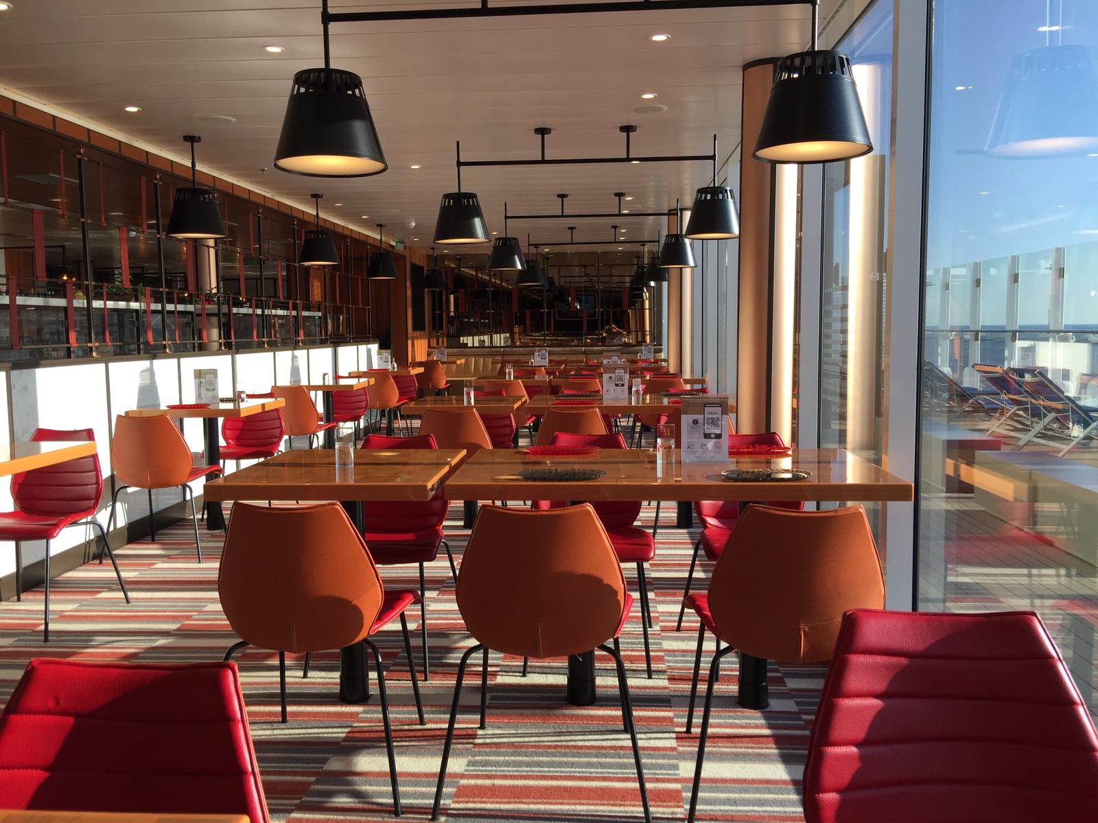 Essen: Man kann auch draußen sitzen, muss aber innen um Erlaubnis fragen weil am Sitzplatz immer die Karte gelesen wird wegen Corona. Essenzeiten sind frei wählbar, weiß aber nicht ob das den wenigen Leuten jetzt geschuldet ist oder immer so ist. Gibt ne Menge Restaurants, ein oder zwei haben immer auf. Ich guck am Terminal und sehe was gerade offen ist und wo ich hin muss.