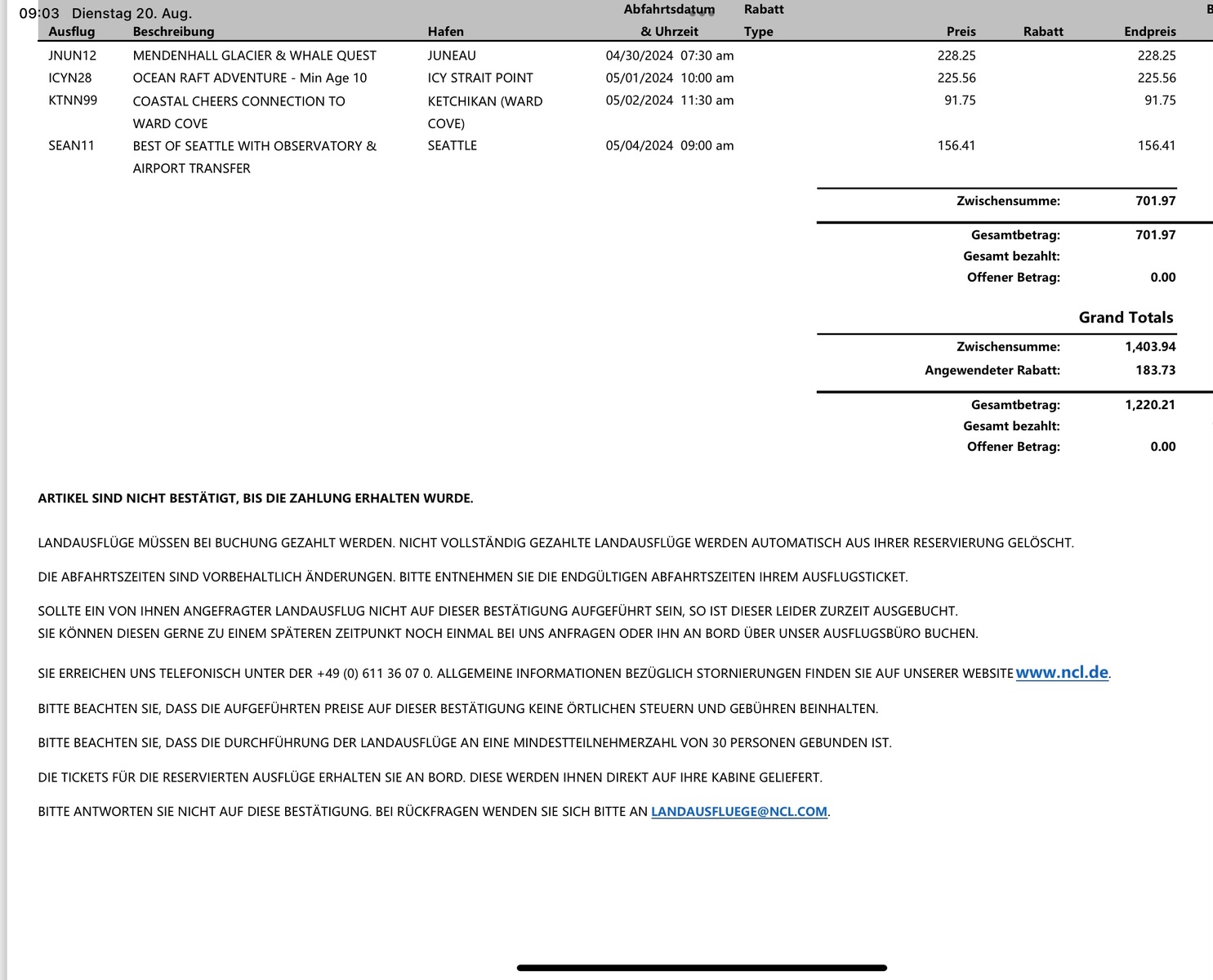 Ich bin mit NCL rund um Südamerika (Buenos Aires bis San Antonio/Chile gefahren. Die Ausflüge waren extrem teuer. Vor dem Hafen konnte man dieselben Ausflüge um ein Drittel des Preises an Bord buchen. War das erste Mal auf meinen zahlreichen Kreuzfahrten, dass ich keinen einzigen Ausflug an Bord gebucht habe. NCL hat es einfach maßlos übertrieben mit den Ausflugspreisen.