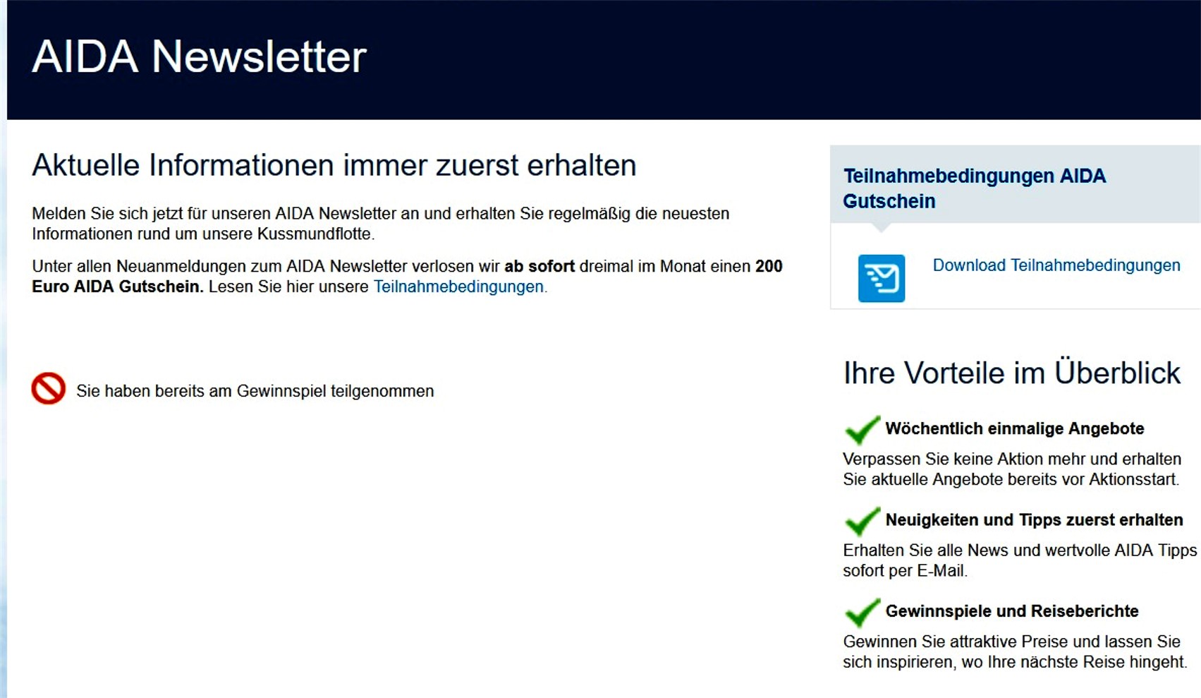 Bitte beachten Sie, dass die Teilnahme am Gewinnspiel verbunden ist mit der Abonnierung des AIDA-Newsletters. Der AIDA-Newsletter wird regelmäßig per E-Mail versendet und enthält aktuelle Produkt- und Reiseneuigkeiten aus der AIDA-Welt. Der Zusendung des Newsletters können Sie jederzeit ohne Begründung widersprechen, ohne dass Ihnen andere als die Übermittlungskosten zum Basistarif entstehen. Klicken Sie hierfür auf den Abmeldebutton im unteren Bereich der Newsletter-Mail.