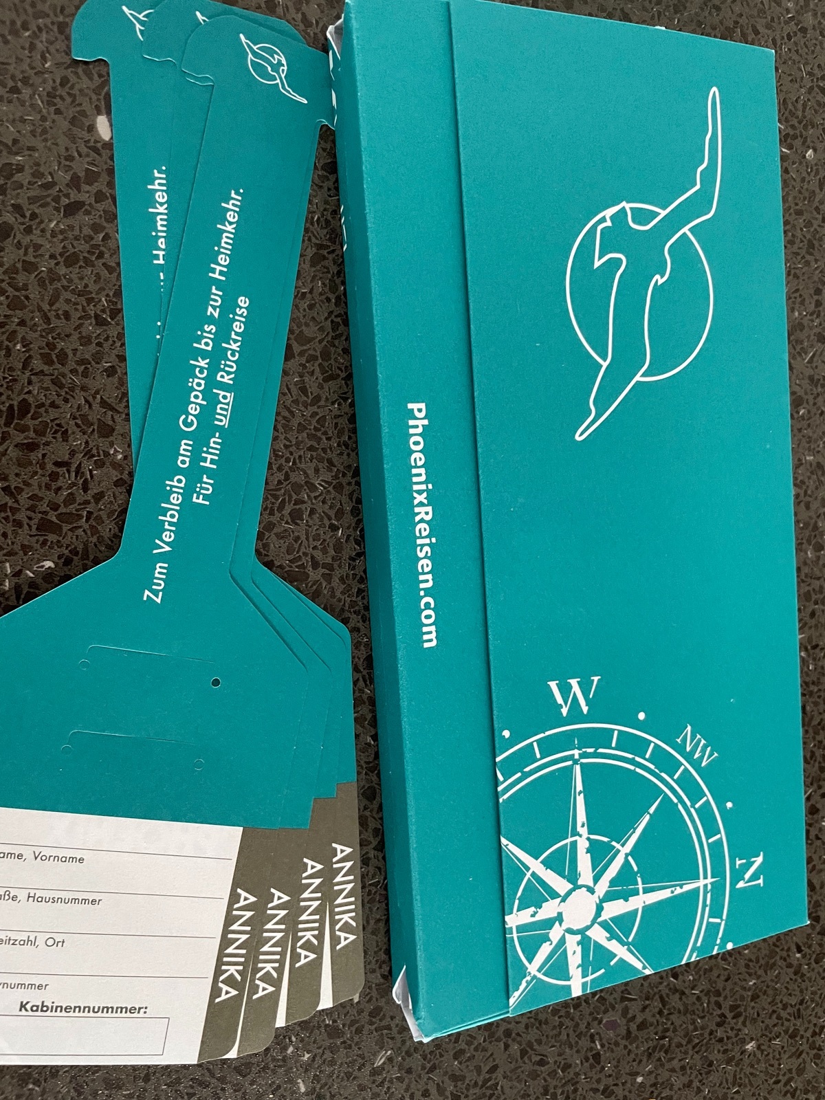 Heute waren unsere Reiseunterlagen für den Fluss von Phoenix in der Post. Die haben ja jetzt ne schöne neue Pappmappe und auch die Kofferanhänger sind neu. Sieht gut aus und umweltfreundlich ist es auch.