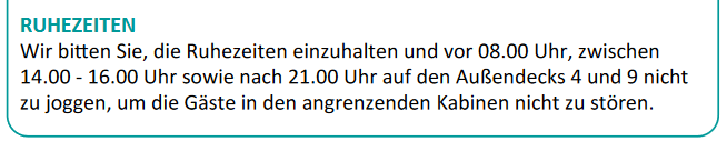 Das Joggen auf dem Promenadendeck ist definitiv nicht störend (ich habe meist eine Kabine auf Deck 4) und ich habe auch erlebt, dass ein Shuffleboard-Wettbewerb während der "Mittagsruhe" begonnen wurde.