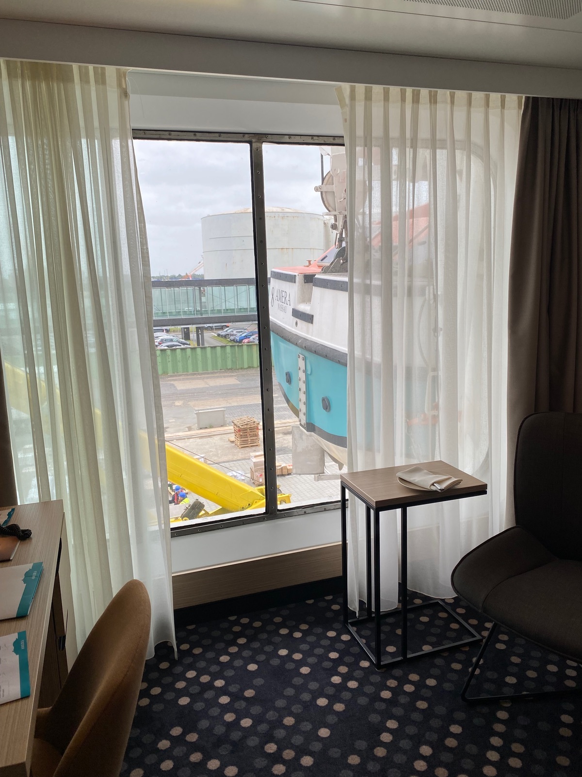 Ich habe gerade mal geschaut, ich war im Mai zur Schiffsbesichtigung. Ich habe zufällig die Kabine 818 fotografiert, da es eine der Schaukabinen war. Die Fotos sind in meiner Datenbank genau nacheinander, daher denke ich dass das Foto vom Fenster wirklich aus der 818 ist, aber ohne Gewähr. Ich schau nachher, wie ich die Fotos hochladen kann