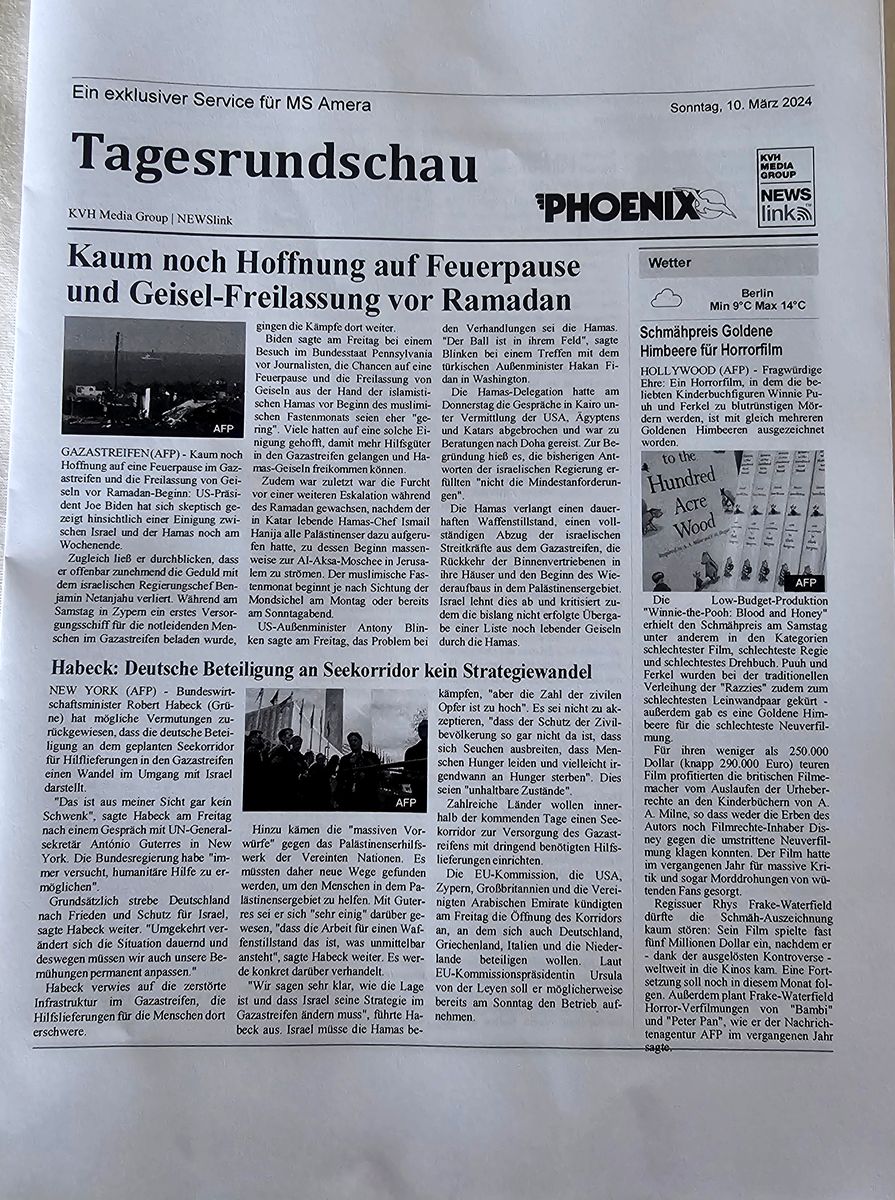 Jeden Morgen, ab ca. 6:30, auch am Sonntag, klemmt die "Tageszeitung " an der Kabinentür: