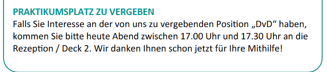 Nach dem Signal mit der Rettungsweste unterm Arm zur Musterstation. Unsere ist das Restaurant Artania. Dort Registrierung der Personen nach Kabinennummer, alles händisch. Danach hinsetzen, zuhören und zuschauen, wie die Weste richtig angelegt wird. Erst dann legt man die Weste selbst an, wer fertig ist, soll sich wieder setzen, damit sie sehen, wer damit nicht klar kommt und Hilfe braucht. Es wird gezeigt, was man tun muss, wenn man im Notfall vom Schiff springen muss. Genauso wie man gesittet zum Rettungboot geht.