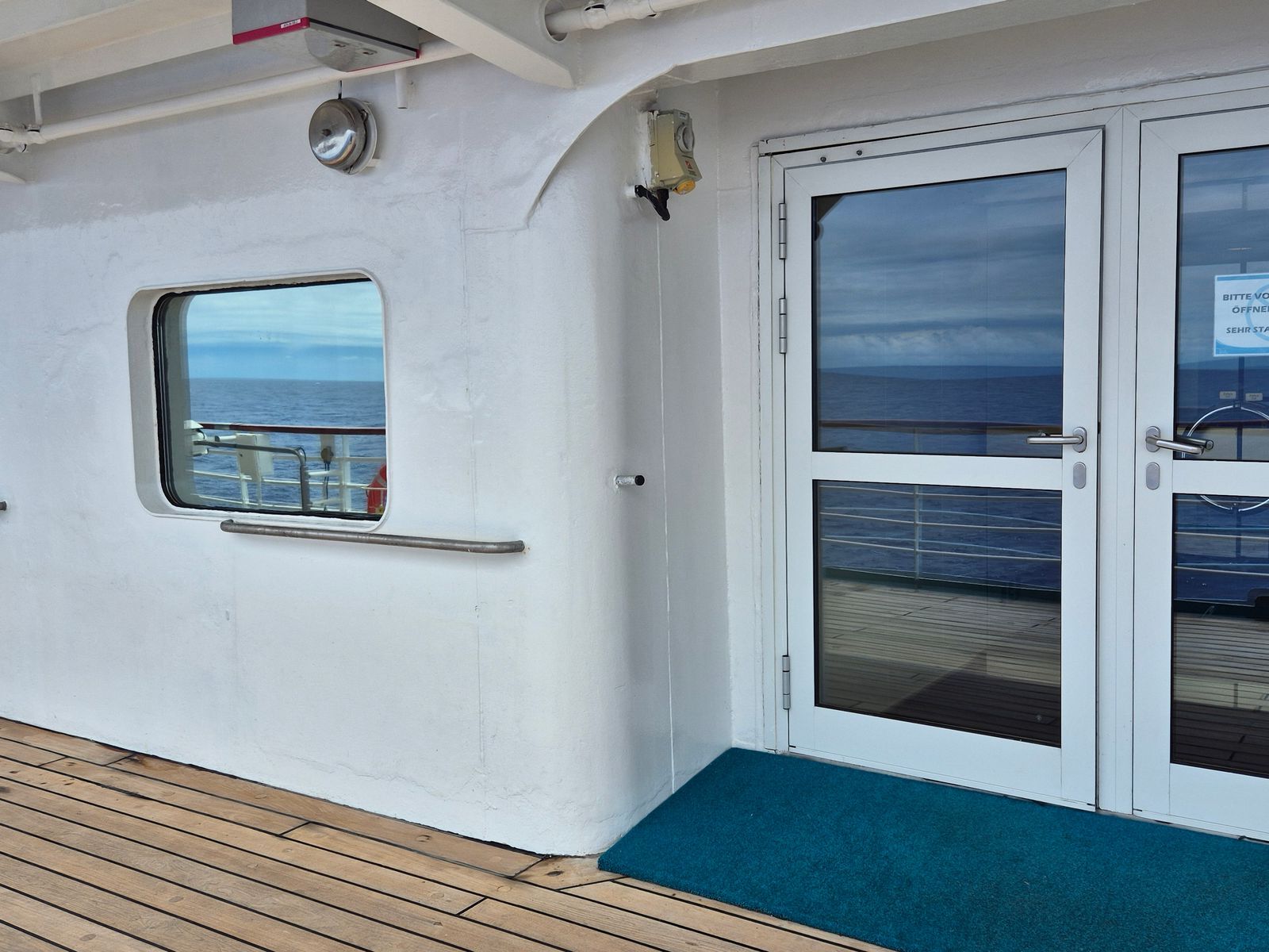 Hier stehe ich direkt neben dem Fenster von Kabine 4607, da wo auf dem oberen Bild, das Geländer ist..