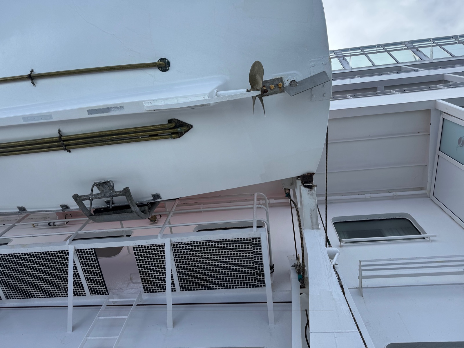 Foto mit Blick aufs Boot von unten (Deck 4). Die Fenster darüber sind es.