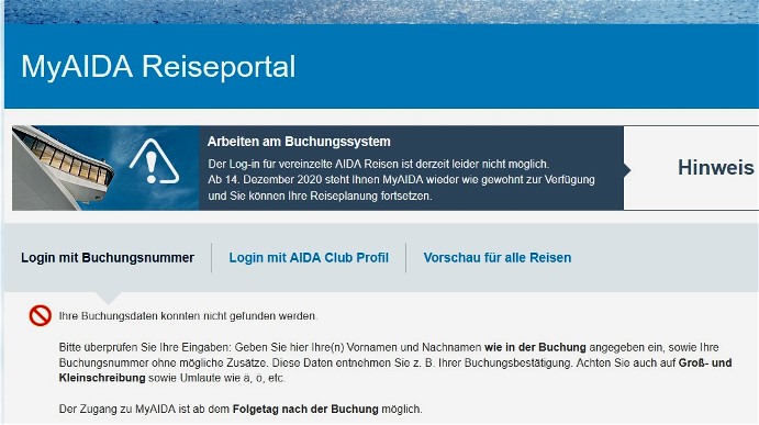 Heute sollte es wieder möglich sein, über MyAIDA die gebuchte Reise aufzurufen, aber leider wurde um eine Woche auf den 14.12.20 verlängert.