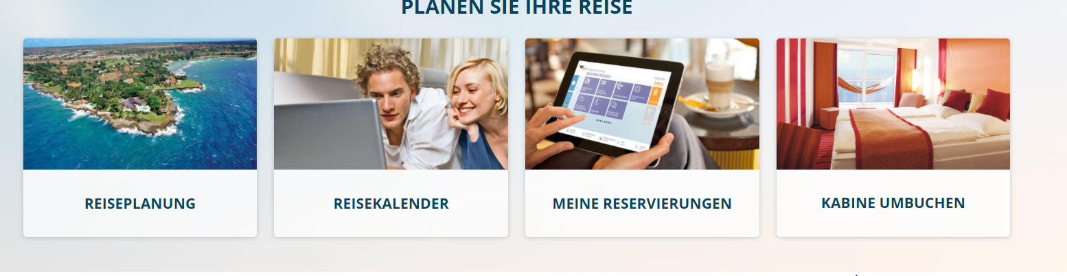 Das ist ein großer Balken , kein kleiner knopf . Oben der erste ist Reiseplanung ( nachdem du auf der Startseite Reise planen angeklickt hast ) und ganz unten der Button ist Kabine umbuchen