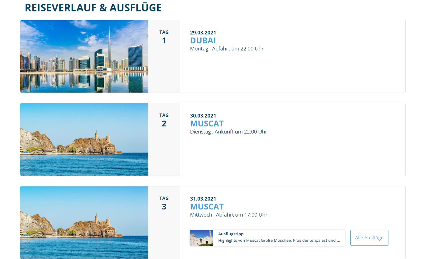 Wenn ich mir die Daten aber genau anschaue, dann stimmen die Tage nicht überein. Bei der einen Tour ist die Prima am 30.03. in Muscat, bei der anderen Tour in Abu Dhabi???