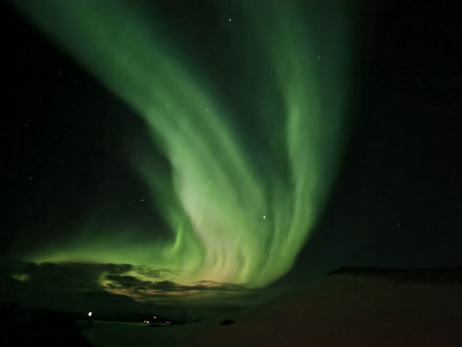 Ja, gestern hatten wir zum dritten Mal auf dieser Reise Glück mit dem Nordlicht. Auch ohne Ausflug, ganz gechillt vom Schiff aus gesehen :thumbsup: