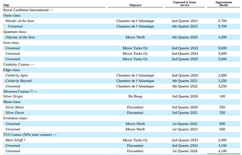 neuer Auslieferungszeitpunkt in Turku Schiff ursprünglich geplant für: Dezember 2021 Costa Toscana Mai 2021 November 2022 Carnival Celebration Oktober 2022 3. Quartal 2023 (Juli-September) Icon of the seas 2. Quartal 2022 (April-Juni) noch nicht verkündet (wohl Frühjahr 2024) Mein Schiff 7 2. Quartal 2023 (April-Juni) 2. Quartal 2025 (April-Juni) Icon 2 2. Quartal 2024 (April-Juni) 2. Quartal 2026 (April-Juni) Icon 3 2. Quartal 2025 (April-Juni) Stand 31.12.2019 (Geschäftsbericht veröffentlicht 25.2.20):