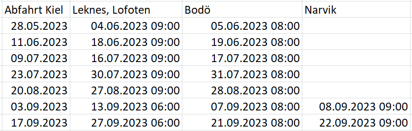 28.05.2023 08:00 luna 17 Tage 18.06.2023 08:00 luna 17 Tage 05.07.2023 08:00 luna 17 Tage 22.07.2023 08:00 luna 17 Tage 08.08.2023 08:00 luna 17 Tage 25.08.2023 08:00 luna 17 Tage 16.06.2023 08:00 sol 17 Tage 09.09.2023 19:00 mar 14 Tage (herbstl. Nordlichter) 23.09.2023 19:00 mar 14 Tage (herbstl. Nordlichter) Für Spitzbergen gibt es auch schon Meldungen: