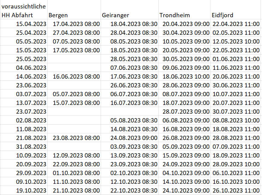 Auf https://planner.cruise-norway.no/ habe ich außerdem eine weitere AIDA Meldung für 2023 gefunden. Das mit 2500 angegebene Schiff (Code für die Luna und Bella auf der Seite) soll am 18.4.23 in Eidfjord anlegen. Das kann nur die Luna sein, weil die Bella zu dem Zeitpunkt noch auf der Transreise Richtung Europa ist. Allerdings ist die Luna am gleichen Tag namentlich in Kirkwall auf den Orkney Inseln gemeldet. Es kommen zu dem Zeitpunkt aber auch keine anderen Schiffe (wie MS3,4,5,6) in Frage. Es bleibt also weiter nebulös, was die Luna im April 2023 genau ab HH oder Kiel macht. Bisher gibt es für die Luna also folgende Meldungen: