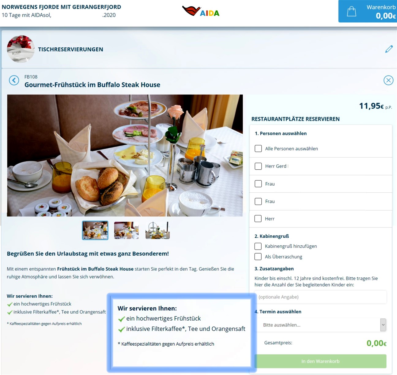 Hier mal ein Ausschnitt aus MyAIDA für die Reservierungen, darunter kann das Frühstück gebucht werden.