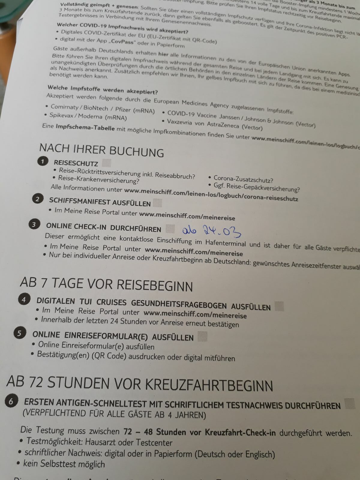 Hallo Simone , das ist richtig bzgl testen. Das ist bei fluganreise der Vorteil gegenüber AIDA. Sollte der test positiv sein, kannst du noch nach Hause. Ob während der Reise noch getestet wird, weiss ich nicht. Man muss (so war es im letzten jahr) jeden Tag zur Temperaturmessung.