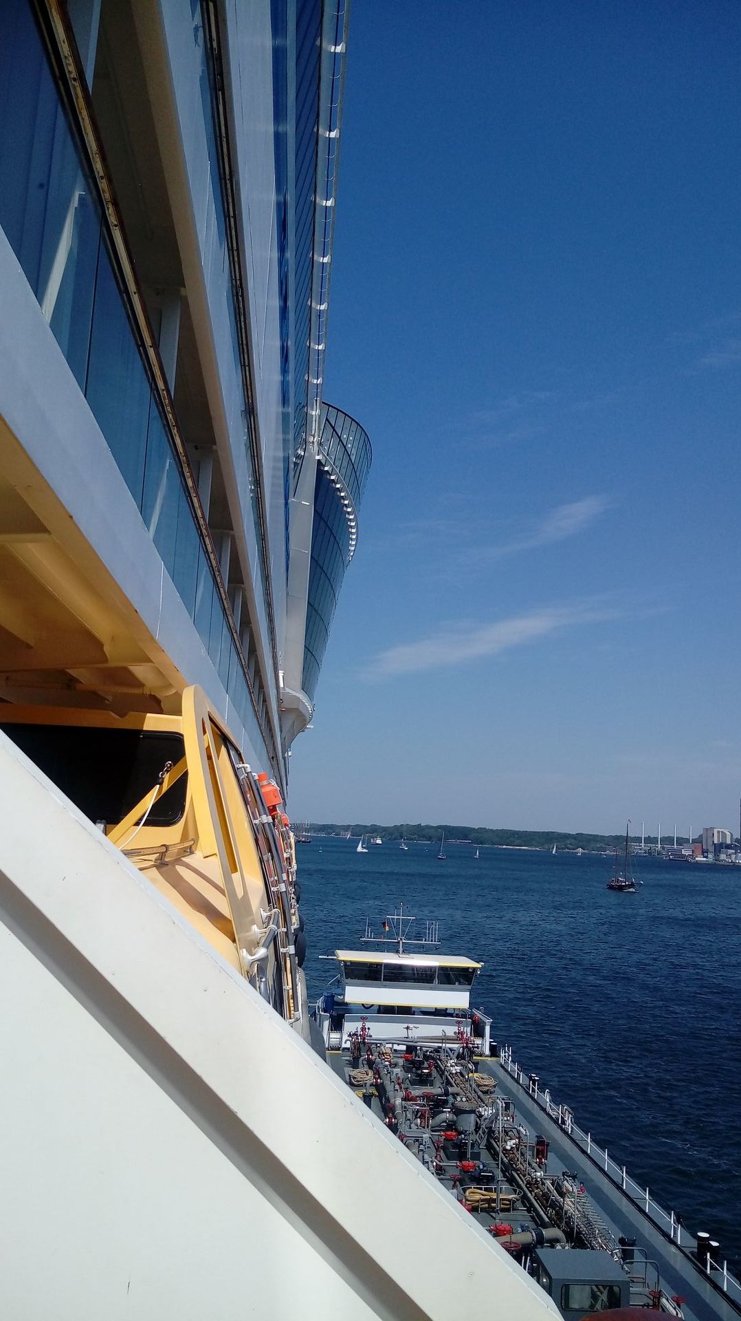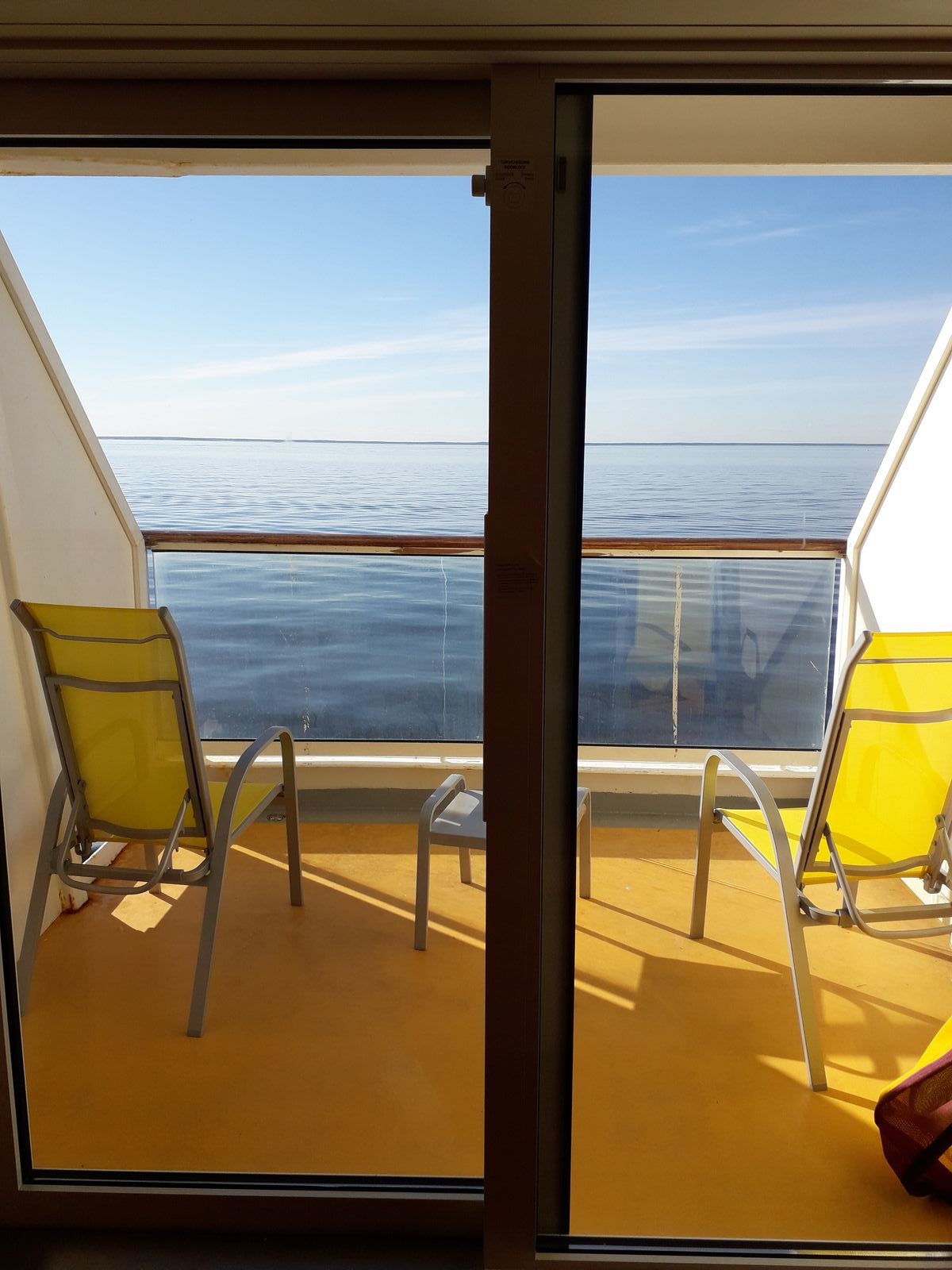 Das ist eine von den Kabinen, bei denen der Balkon größer ist. Auf der einen Seite grenzt er direkt an die Rettungsboote.