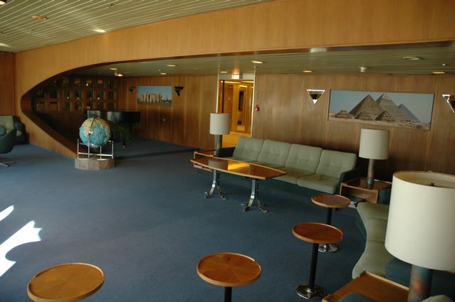 zuerst aus der Zeit, als das Schiff noch TS Hamburg hieß (war als Ocean-Liner konzipiert und auch kurz im Transozean-Linienverkehr eingesetzt) der Club unter dem Namen Club Helgoland, dann zwei Perspektiven des selben Raums, jedoch ummöbliert und dann mit dem Namen Zhiguli-CLub. Leider hab ich kein Rechte freies Foto des "Tagungsraums" mit den Politikern und im Hintergrund hinter Glas vielen Schiffs-/Hafen-Plaketten; wer möchte kann das im www selbst suchen, es gibt ein solches Foto.