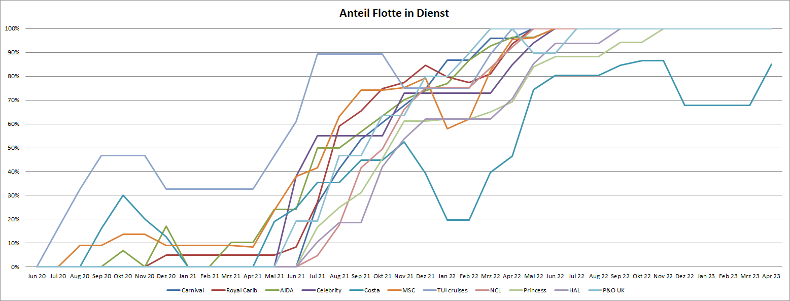 ColorLine: 3x zuletzt Fantasy (20) — Costa: 15x zuletzt Fortuna (26) — MSC: 2x zuletzt Musica (13) — AIDA: 9x zuletzt AIDAmar (25) — HL-Cruises: 1x Columbus 2 (13) — A‘Rosa: 2x zuletzt Aqua (20) — Royal Caribbean: 10x zuletzt Symphony of the Seas (25) — TUI Cruises: 12x zuletzt Mein Schiff 1 (25) — NCL: 7x zuletzt NCL Aqua (25) — Celebrity: 5x zuletzt Celebrity Infinity (24) — Princess: 2x zuletzt Sky Princess (22) — Cunard: 2x zuletzt Queen Mary 2 (22) — Phoenix: 4x zuletzt Artania (23) — Oceania: 1x Nautica (22) — HAL: 3x zuletzt Eurodam (24) — Nicko Cruises: 1x Vasco da Gama (23) --- Disney: 1x Disney Dream (24)