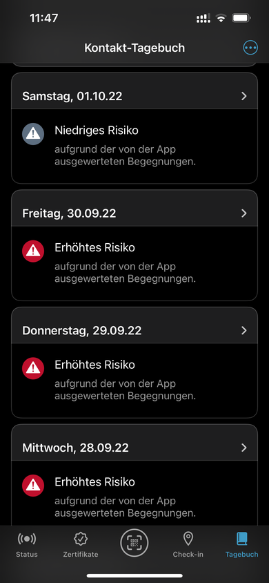 Inzwischen auch der 8te Tag rot: "Erhöhtes Risiko aufgrund der von der App ausgewerteten Begegnungen". Somit für jeden Tag der Kreuzfahrt. Die Tage davor und danach bisher nichts.
