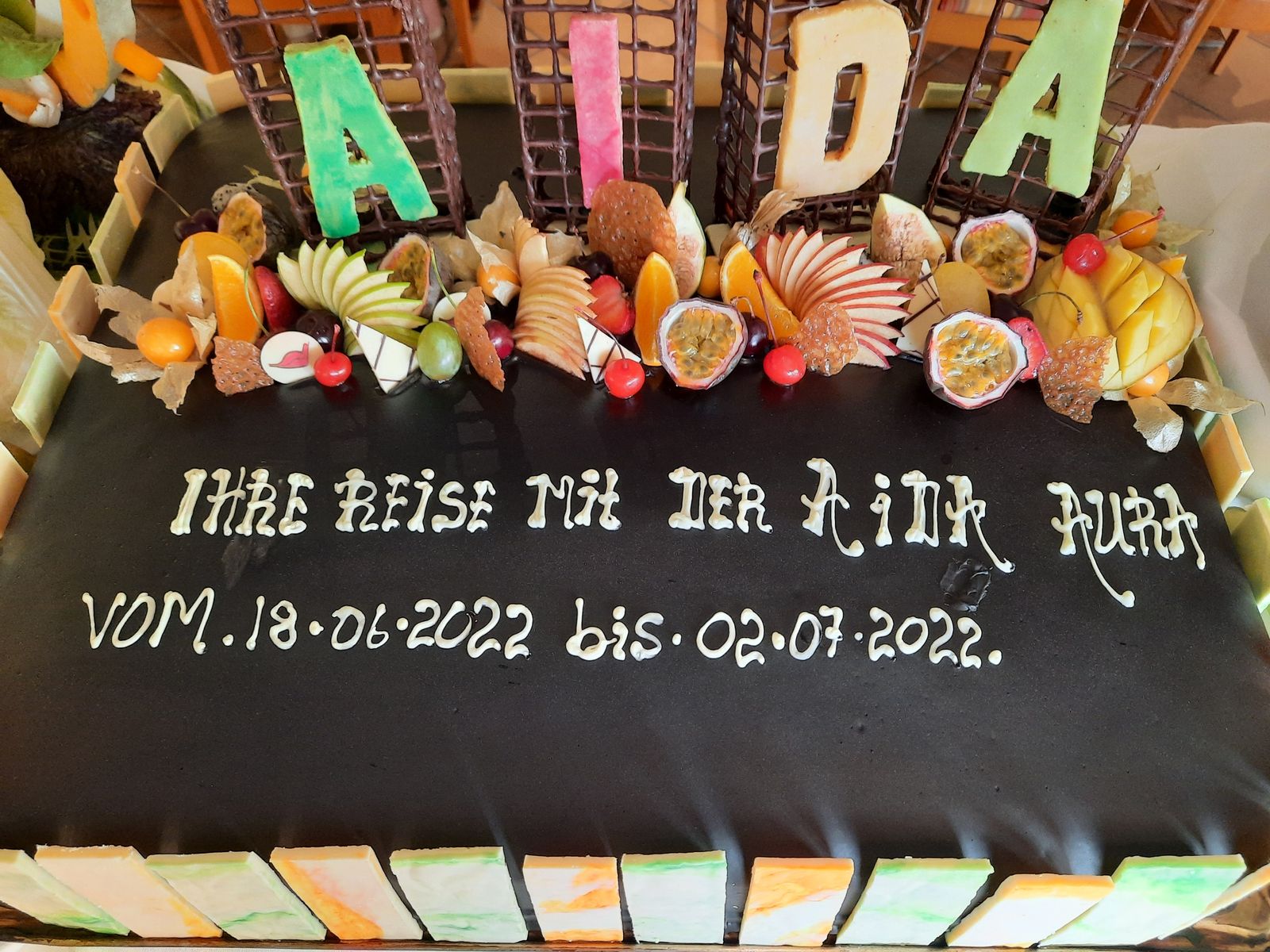 Angeblich waren der Überzug aus Schokolade und die Früchte echt. Insofern war es eher eine Dekorationstorte als eine Plastiktorte. Und zum Fotografieren nachhaltig und umweltfreundlich.
