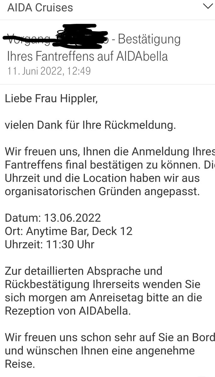 vielen Dank für deine Bereitschaft ein Fantreffen zu organisieren. Wir haben dir auch schon zugesagt. Gestern Abend meinte ich mich zu erinnern, dass AIDA vorab gerne die Namen der Teilnehmer und Kabinennummer hätte und dann einen Termin und Ort nennt wo das ganze stattfindet (so war es jedenfalls mal vor 4 Jahren).
