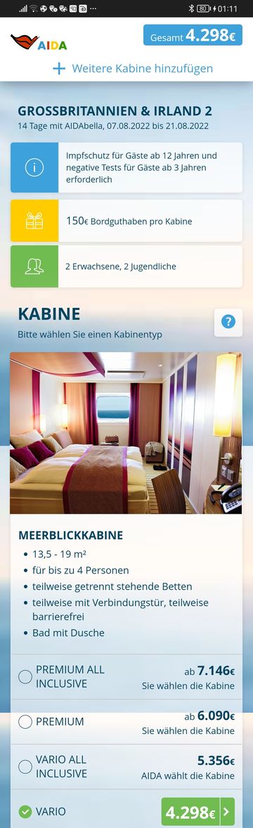 Ich habe letzte Woche eine Außenkabine für 3998€ gebucht (Vario), die kosten jetzt im Vario 4298€