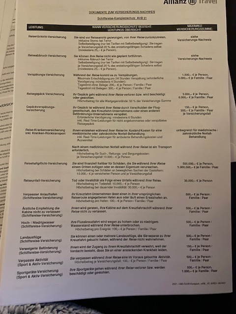 Tja, bei genauem Hinschauen haben wir den Haken gefunden: wir haben nicht die Schiffsreise Komplettschutz abgeschlossen, sondern die Reiserücktritt-Komplettschutz - und da steht das nicht drin.